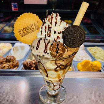 Treatz is a restaurant and coffeehouse in St Anns Shopping Centre offering desserts, waffles, sundaes, and coffee drinks in a contemporary setting. The menu features both ready-made and prepared items, ranging from eggless waffles to ice cream combinations.