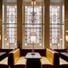 Dishoom is an Indian restaurant occupying a former Masonic Hall in Manchester and spreads across multiple floors with marble tables and stained glass windows throughout. The space features traditional Indian decorative touches while retaining architectural details from its early 20th-century building.
