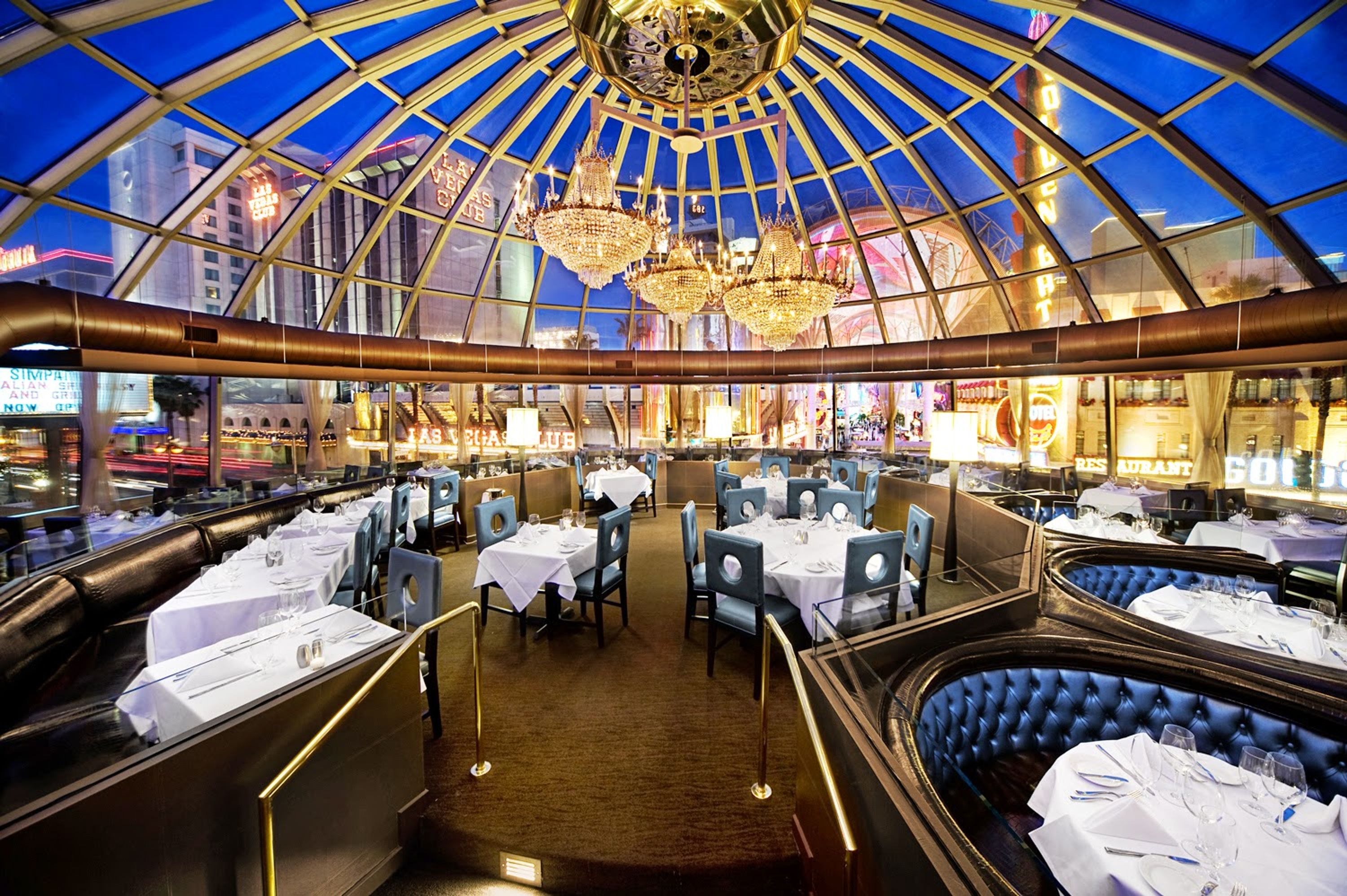 The 1970s glass dome architecture provides panoramic views of downtown Las Vegas from the rooftop terrace, creating a distinctive dining atmosphere.