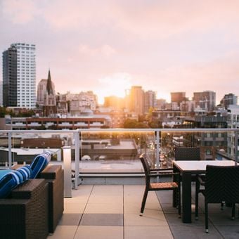 The Aura Rooftop restaurant occupies the fifth floor of JW Marriott Charlotte, providing views across the urban landscape through its mirror-like facade.