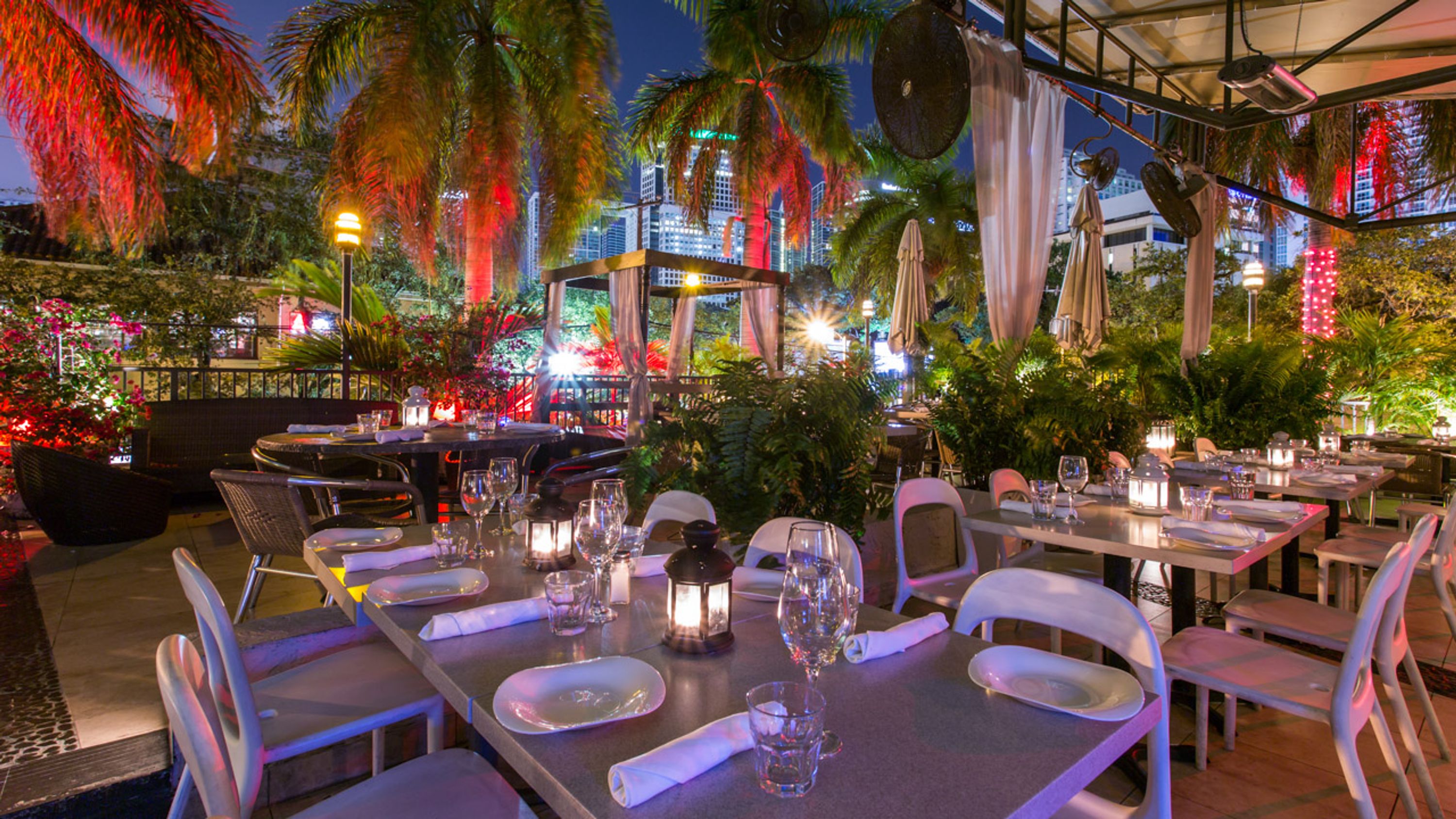 The building features two levels of dining space with modern furnishings, exposed brick walls, and floor-to-ceiling windows overlooking Miami's financial district.