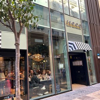 Neco is a Mediterranean buffet restaurant with multiple locations throughout Valencia, offering more than 200 dishes from the region's traditional cuisine. The spaces are designed for casual dining with self-service counters and seating areas throughout the day.
