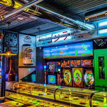 The dining space blends elements from Osaka with playful details such as pufferfish-shaped lamps and arcade machine murals decorating the walls. As you move through the room, you encounter this mix of Japanese tradition and modern leisure culture.