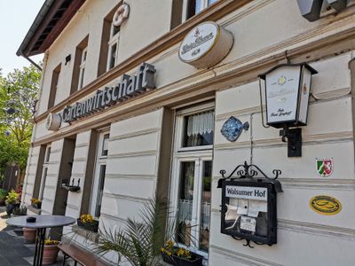The Walsumer Hof presents traditional seafood dishes in a riverside establishment with an outdoor dining area and an indoor dining room.