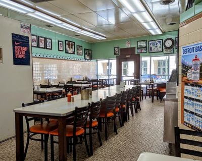 The restaurant maintains traditional Detroit food service methods, with orders shouted to cooks and plates rapidly delivered across the metal counter.