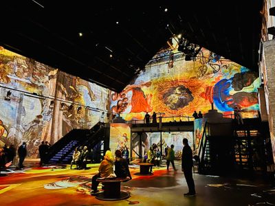 The Fabrique des Lumières displays digital artwork through 100 projectors across vast industrial walls reaching heights of 17 meters in a former gasworks building.