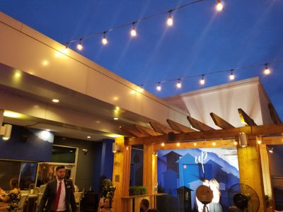 UP occupies the eighth floor of the Fairfield Inn & Suites, featuring outdoor seating with heaters, gas fire pit tables, contemporary furnishings, and neon lighting that creates a modern lounge environment.