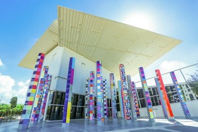 The museum spans 3,200 square meters and features twenty multicolored pillars at its entrance, with nine additional pillars inside the exhibition space.