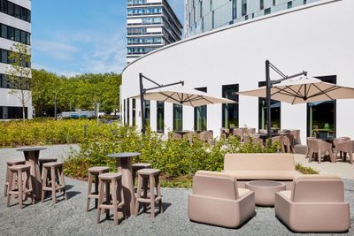Guests can enjoy panoramic views of Hamburg from the 18th-floor sauna and practice their skills at Germany's first mini disc golf course.