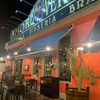 Amore Verace is an Italian restaurant in a commercial building at Via Don Alberto Carozza 3, offering both indoor seating and an outdoor terrace. The menu features traditional pizza, pinsa, and various Italian dishes prepared fresh in the kitchen.