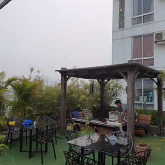 Da Rooftop is a restaurant located on the top floor of a building in Dhaka with a good view of the city streets below. The space features both open-air seating on a large terrace and air-conditioned areas, with tables equipped with umbrellas and basic but comfortable furniture.