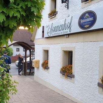 The Sonnenhof building features a rustic dining room for 40 guests, additional space for 70 people, and a spacious outdoor beer garden with covered pergola.