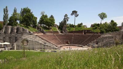 The extensive remains of Augusta Raurica include a theater, temples, baths, and houses spread across the south bank of the Rhine river near Basel.