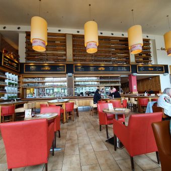 ALEX Bremen Waterfront is a restaurant along the harbor waterfront that serves seafood and diverse dishes. It features indoor seating areas and outdoor tables with views of the water and surrounding cityscape.