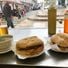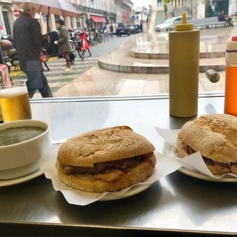 Each bifana costs 2.50 euros and comes with optional mustard and chili oil, typically accompanied by cold Super Bock beer.