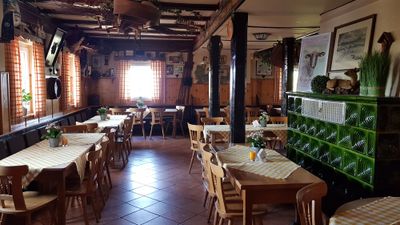 The restaurant incorporates regional cooking methods with a menu featuring house-smoked meats and traditional German mountain dishes served in a wooden interior setting.