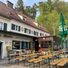 Biergarten Gasthaus zur Mühle is a restaurant with beer garden in Straßlach-Dingharting serving traditional Bavarian dishes and local beers. It features an outdoor seating area beneath trees where guests gather for food and drink.