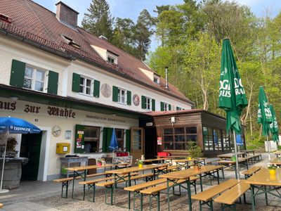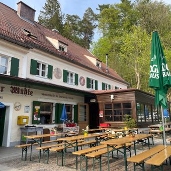 The establishment takes its name from a mill that once operated at this location and remains part of the local identity. Visitors sit under large trees as in many Bavarian beer gardens, experiencing a tradition that connects food, drink, and community.