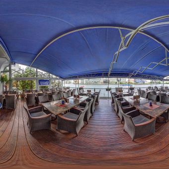 Artemis is a Greek restaurant in Berlin that sits near the Spree River in the eastern part of the city. The dining space includes both an interior area and an outdoor terrace with river views.