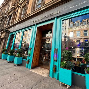 Topolabamba is a Mexican restaurant in central Glasgow, spread over two floors with colorful wall decorations, wooden tables, and metal chairs. Large windows let in plenty of daylight and give the space an open feel.
