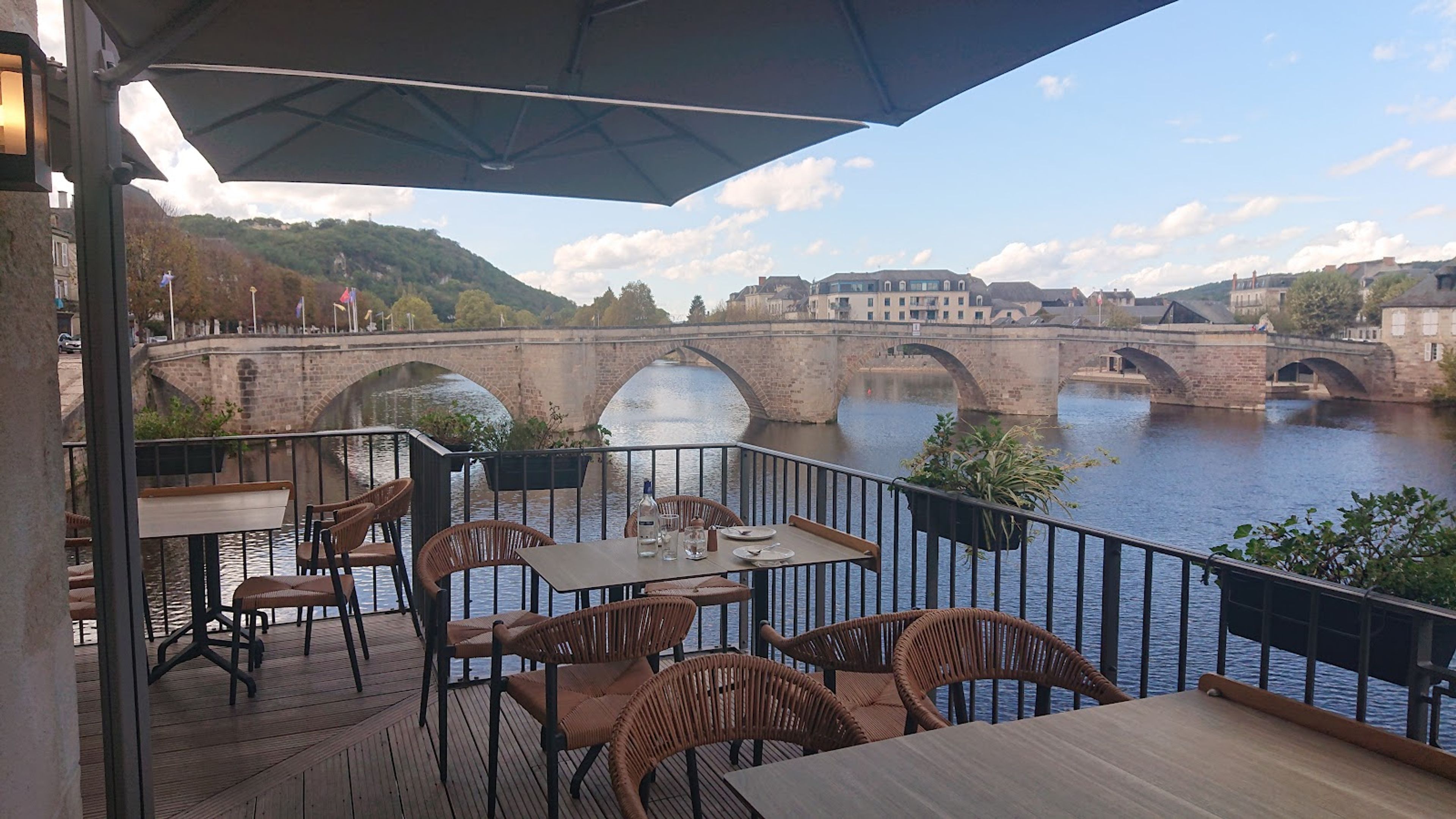 The dining establishment offers views of the twelfth-century Pont Vieux, a stone bridge that stands as a testament to medieval architecture.