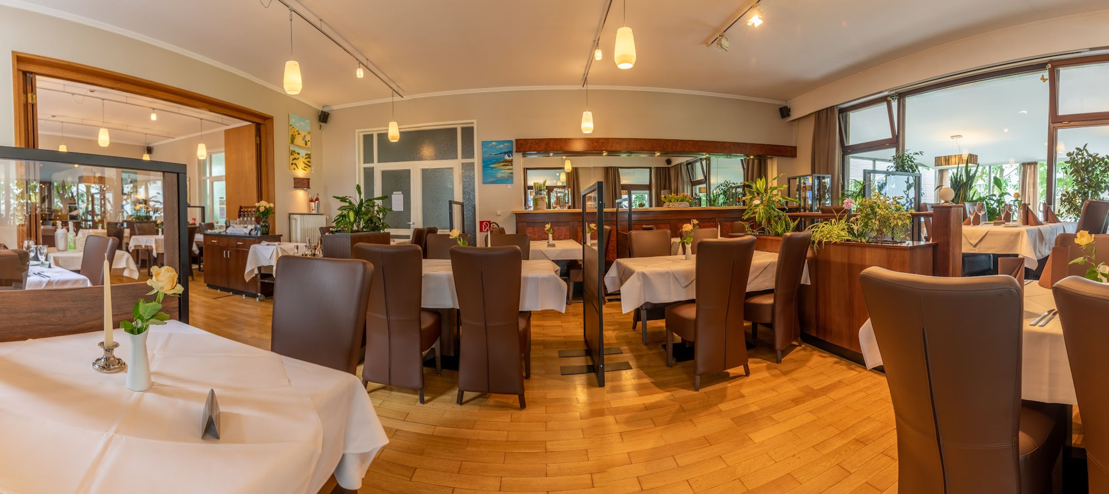 The menu combines German culinary traditions with international influences, offering specialties like wild cream soup with forest mushrooms and goose breast with orange sauce.