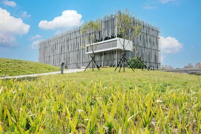The New Taipei City Art Museum features silver tubular structures meant to represent reeds swaying in the wind against the natural environment.