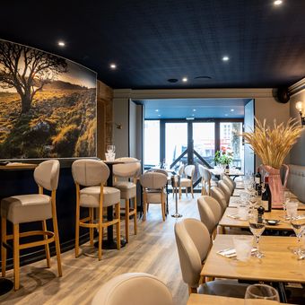 Located at 3 Place Saint-Georges, Maison Burgarella includes two dining spaces: Table de Romane brasserie and the upstairs La Tour restaurant with an open kitchen.