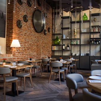 Albufera is a Spanish restaurant in Milan that serves traditional dishes like paella and tapas prepared with authentic methods. The space features exposed brick walls, warm colors, and simple wooden tables with wrought iron details that create a welcoming environment.