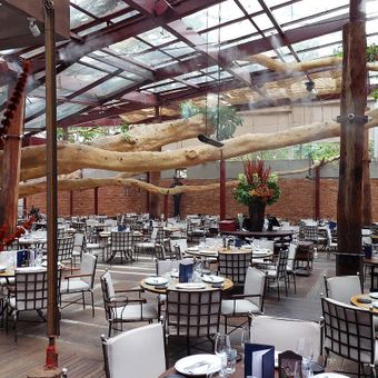 A Figueira Rubaiyat is an upscale steakhouse in São Paulo built around a century-old fig tree whose branches extend through a glass-covered dining space. The interior combines the tree's natural structure with modern comfort and showcases an open grill culture where meat specialists work directly at your table.