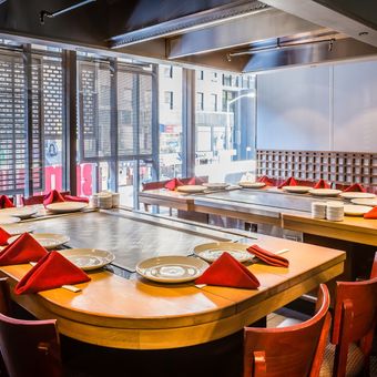 Benihana is a Japanese restaurant in Manhattan where chefs prepare fresh vegetables, rice, and proteins such as chicken, beef, shrimp, or salmon on grills built into the dining tables. Diners sit around heated steel surfaces and watch their meals being cooked from start to finish.