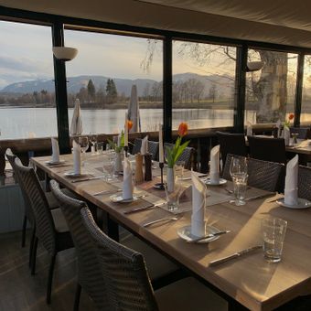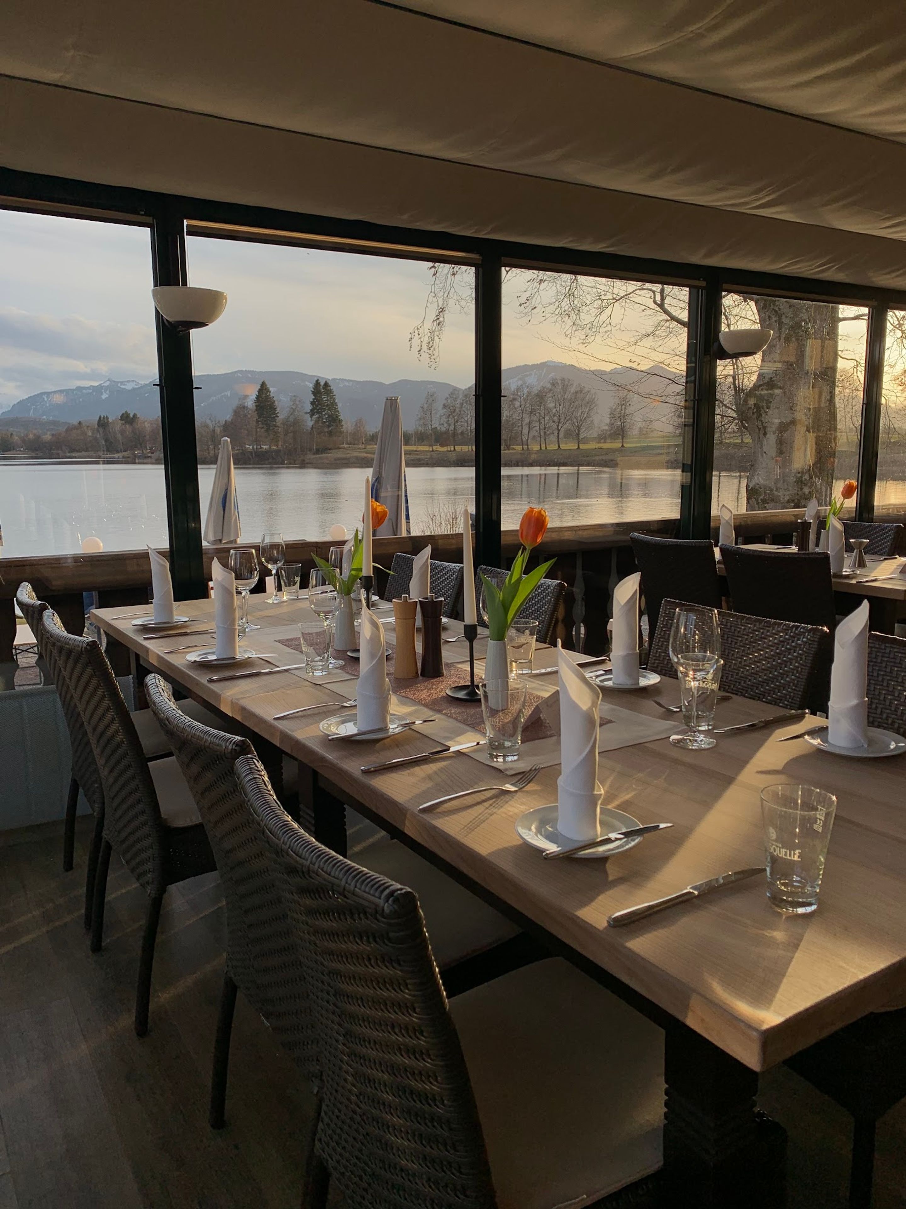 Seerestaurant Alpenblick stands on the shores of Staffelsee lake, providing dining spaces that face the water and surrounding natural landscape of Bavaria.