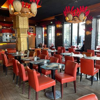 The restaurant displays Native American imagery throughout its interior and serves adapted versions of classic dishes like tacos and burgers for French diners. The decor creates a specific visual environment that surrounds visitors as they eat.