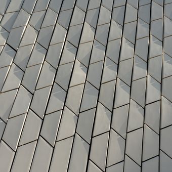 The building skin uses about 15,000 three-dimensional ceramic tiles that shift in color depending on light and water conditions. The effect changes throughout the day, so the white volume can appear silvery or creamy and seem to merge with the surroundings.