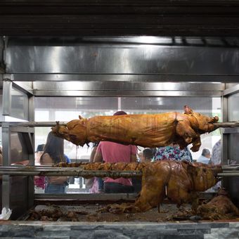 Visitors can watch whole pigs slowly turn on spits as their skin gradually turns golden brown. This open cooking process reveals how much patience and skill go into getting the meat cooked just right.