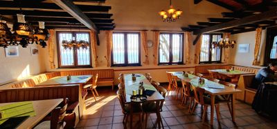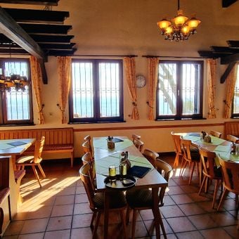 The restaurant specializes in Palatinate regional dishes, including traditional Leberknödel, bratwurst, and Saumagen served with sauerkraut and fresh bread.
