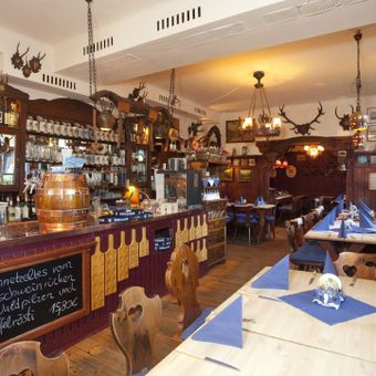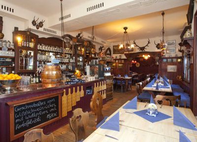The restaurant maintains its Bavarian heritage through a menu featuring venison roast with dumplings and Munich-style schnitzel specialties.
