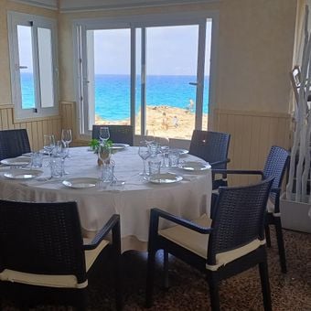 Can Rafalet is a seafood restaurant with a glass-enclosed dining room and terrace overlooking the Mediterranean, featuring views of La Mola cliffs and turquoise waters. The venue sits right along the harbor and offers daily menus built from fresh catches.