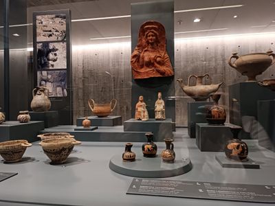 Exhibition areas present artifacts from the Bronze Age through Ottoman times, including the Polyxena sarcophagus, gold jewelry, coins, and military equipment.