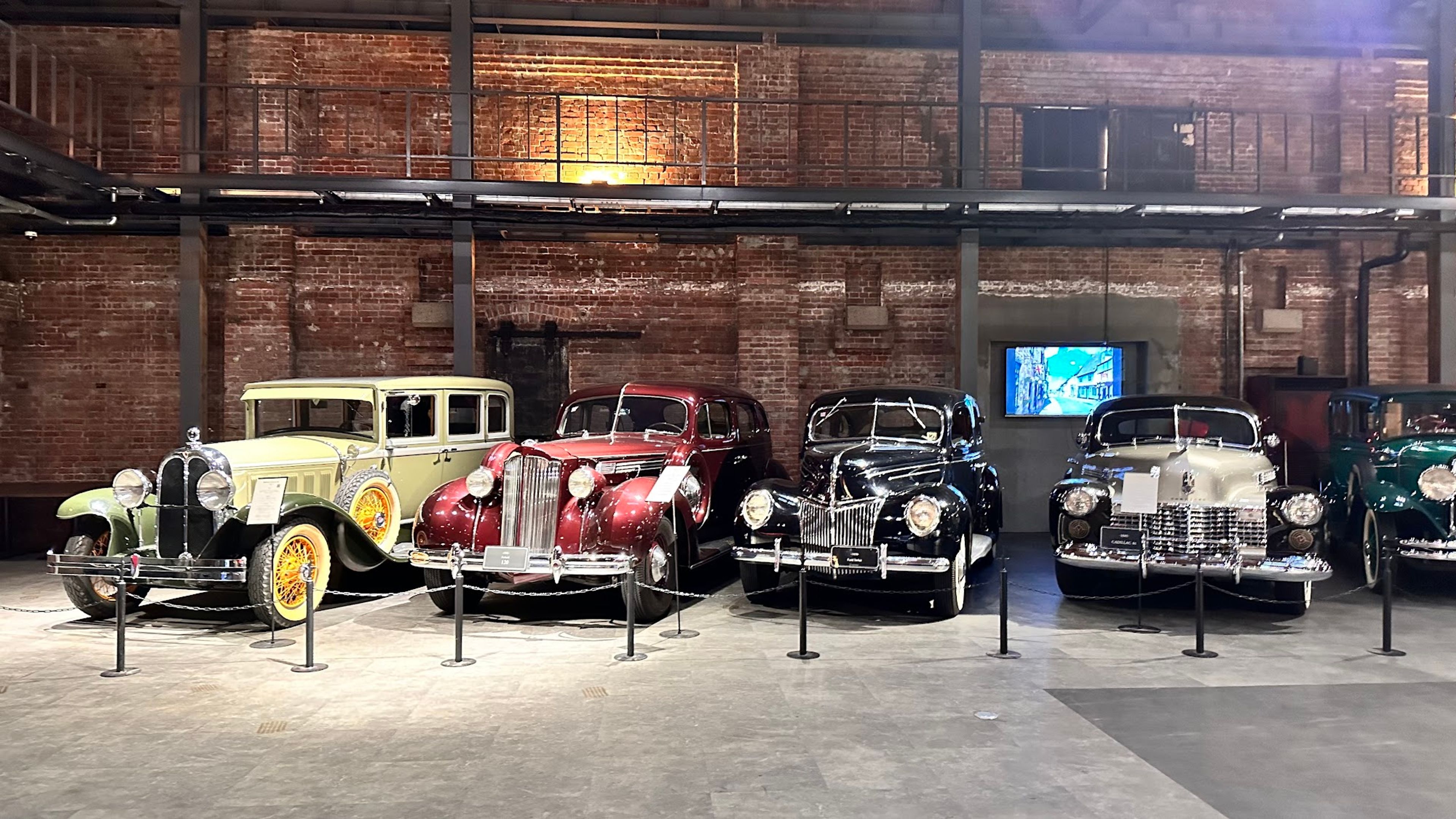 The Glion Museum exhibits numerous vintage automobiles within a century-old red brick warehouse that reflects industrial architecture from the 1920s.