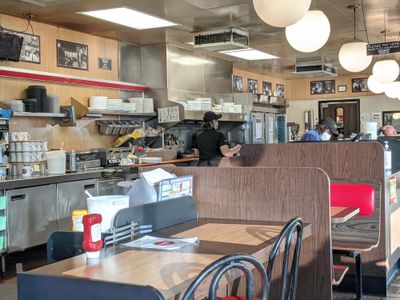 The restaurant accepts cash and cards, offering table service and counter seating with menu prices starting at five dollars.