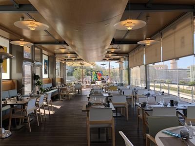 The restaurant features an indoor dining area with contemporary furnishings and large windows that allow natural light to flood the space.