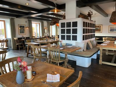 The restaurant serves regional Bavarian specialties, including Wiener Schnitzel, roasted suckling pig with pretzel dumplings, and fresh pastries from the in-house patisserie.