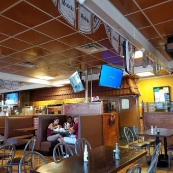 The restaurant has many TVs inside showing sports broadcasts, making it a popular spot for fans to watch games while eating. This setup makes the experience special for those who want to enjoy food and sports together.