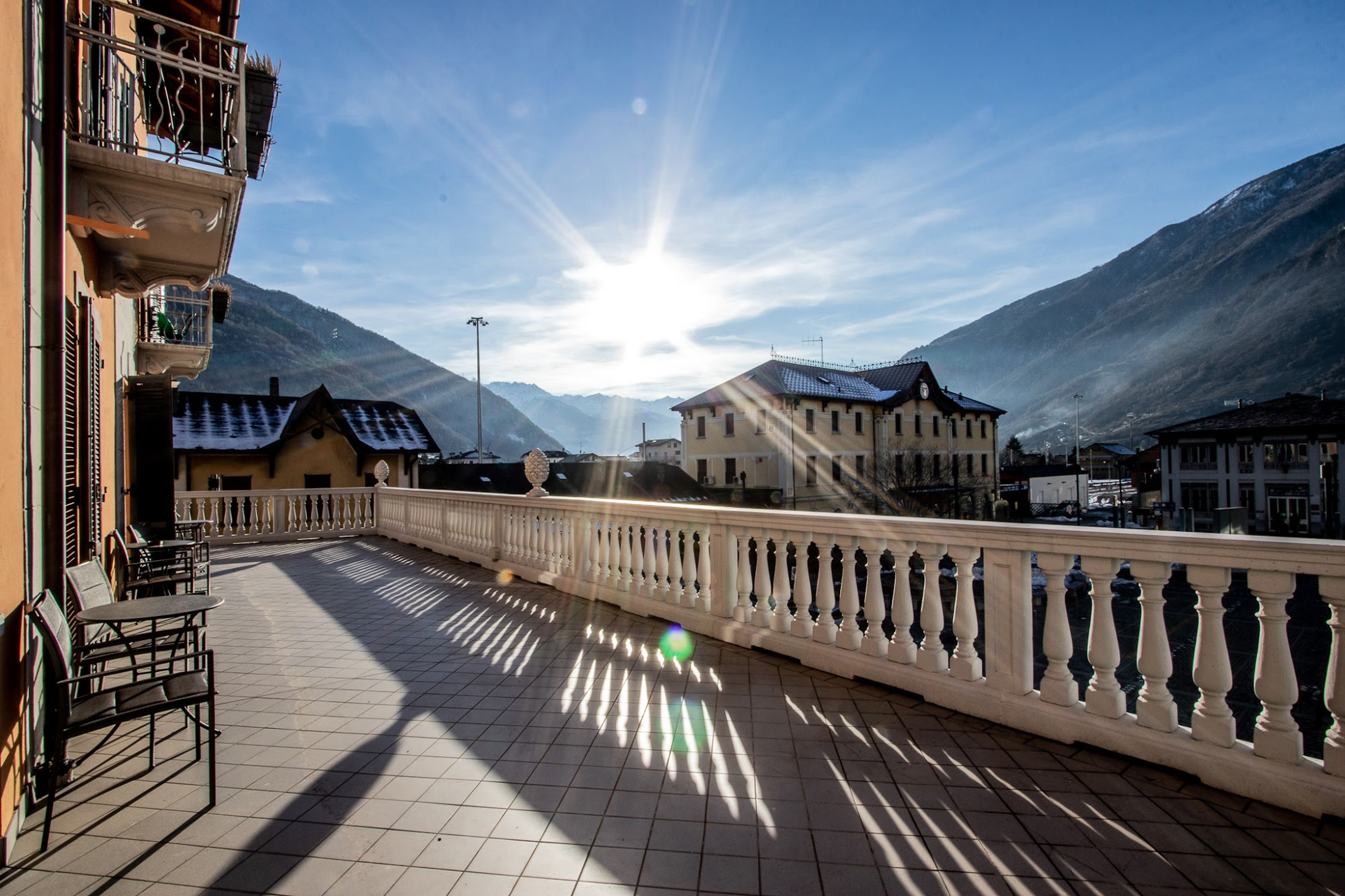 The hotel's top floor contains attic rooms connected by a panoramic elevator, offering views across the Valtellina Valley and surrounding Alpine peaks.
