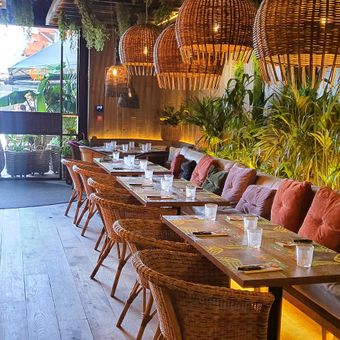 The space was transformed from a former fast-food spot into a dining venue with tropical touches and classic cooking. This blend of new style and traditional food creates an unexpected mix that stands out in the shopping center.