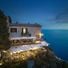The Château Eza restaurant occupies multiple levels in the medieval village of Èze, featuring stone walls and glass-enclosed dining areas overlooking the Mediterranean Sea.