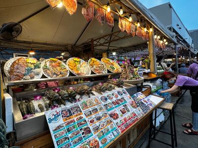 The market operates daily from 4 PM to midnight, with narrow walkways that become more congested during peak evening hours after 7 PM.