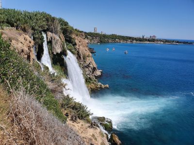 The Lower Duden Waterfall creates a natural freshwater curtain as it falls from coastal cliffs directly into the salt waters of the Mediterranean Sea.