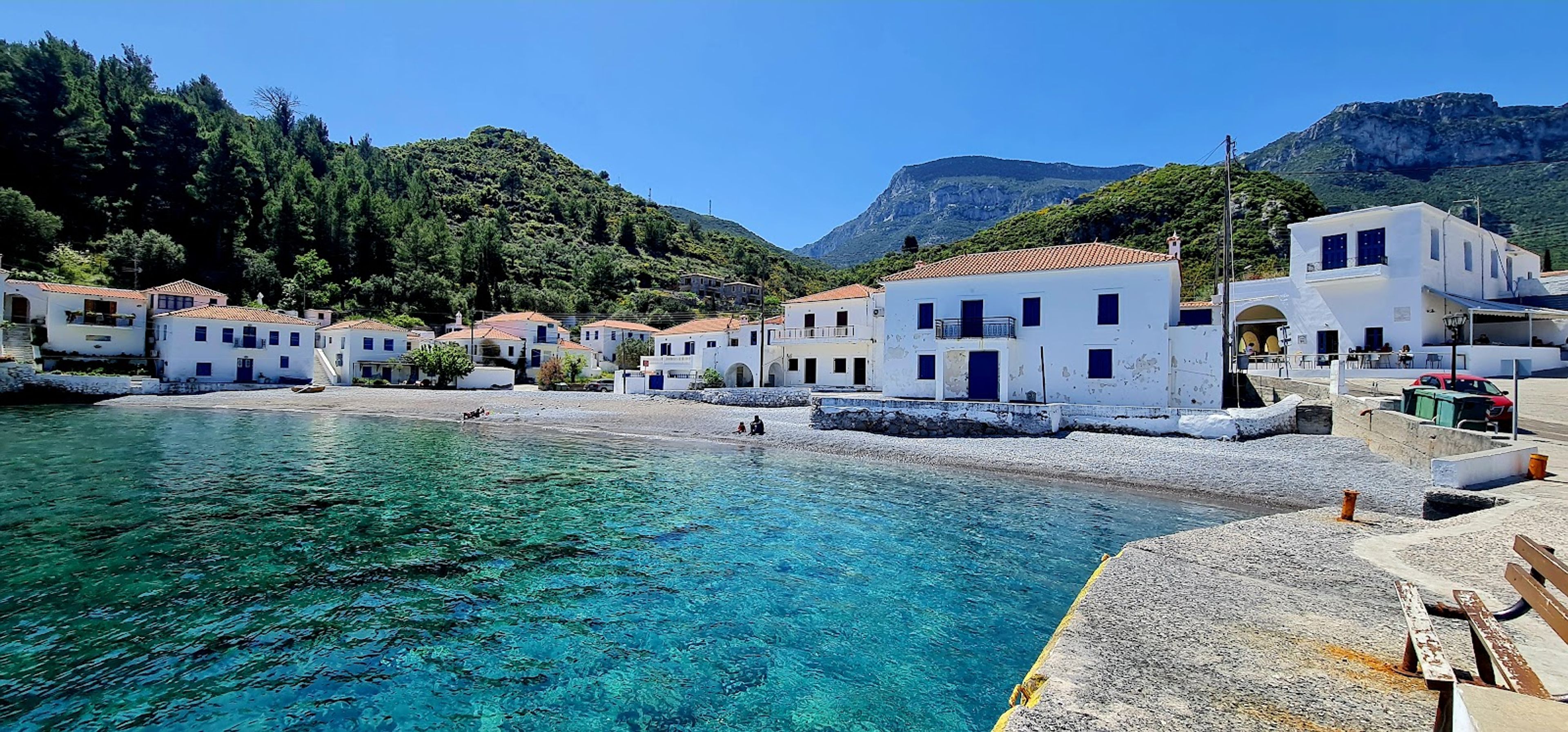 Kyparissi spreads across three distinct sections at the foot of Parnonas mountains, featuring white houses against the backdrop of the Myrtoan Sea.